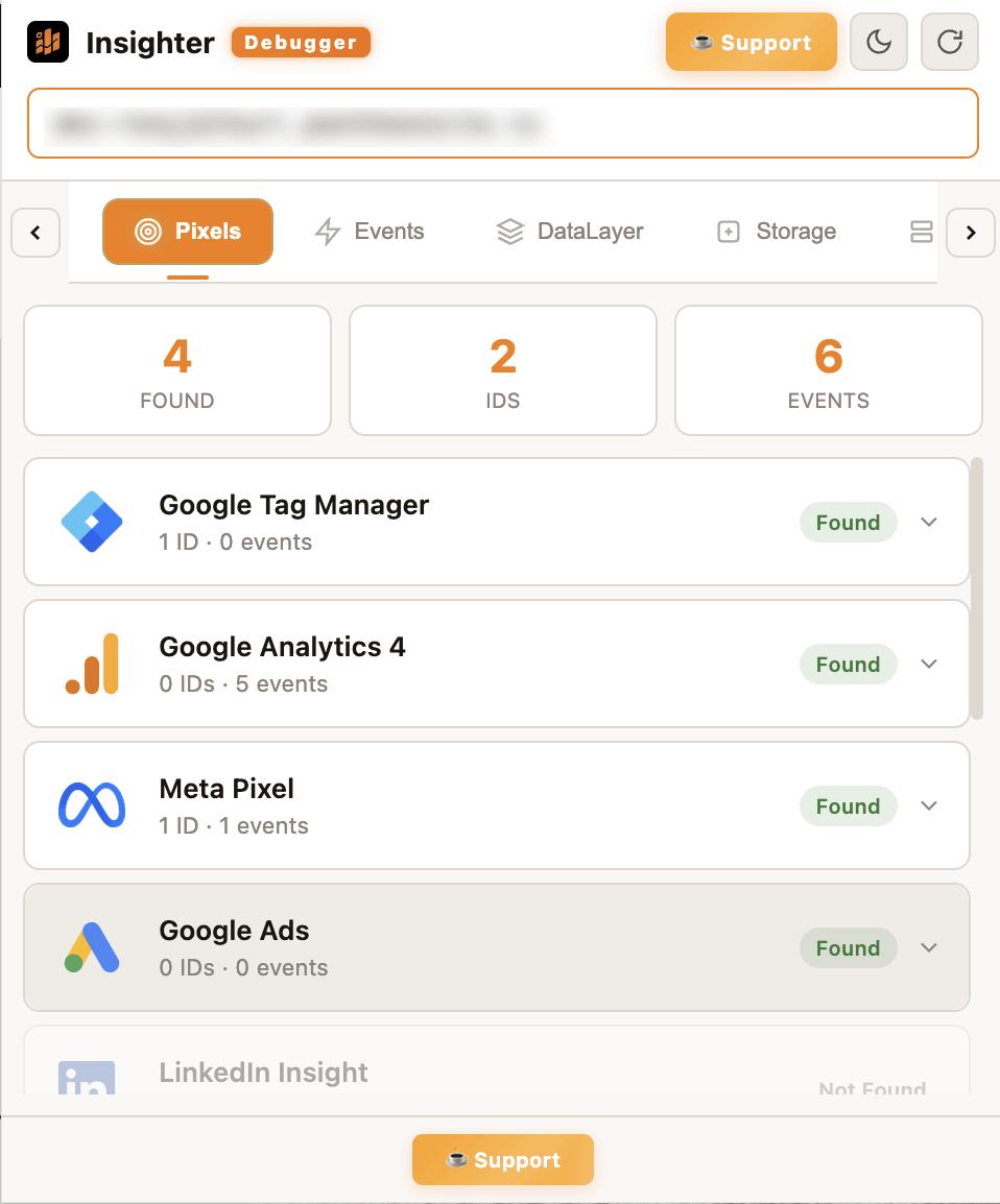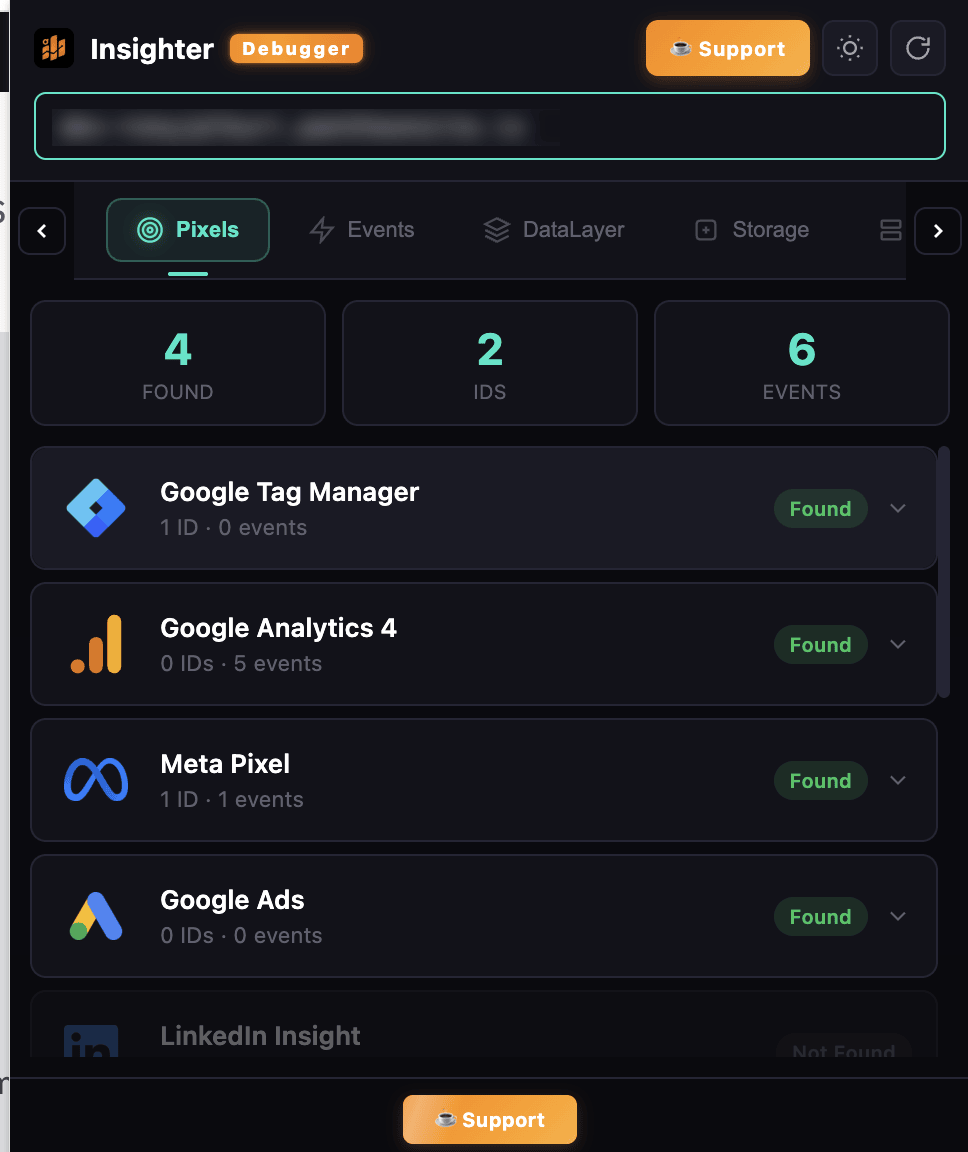 Detect GA4, Meta, GTM, Google Ads, TikTok, LinkedIn & 200+ platforms with IDs, events & SST status.