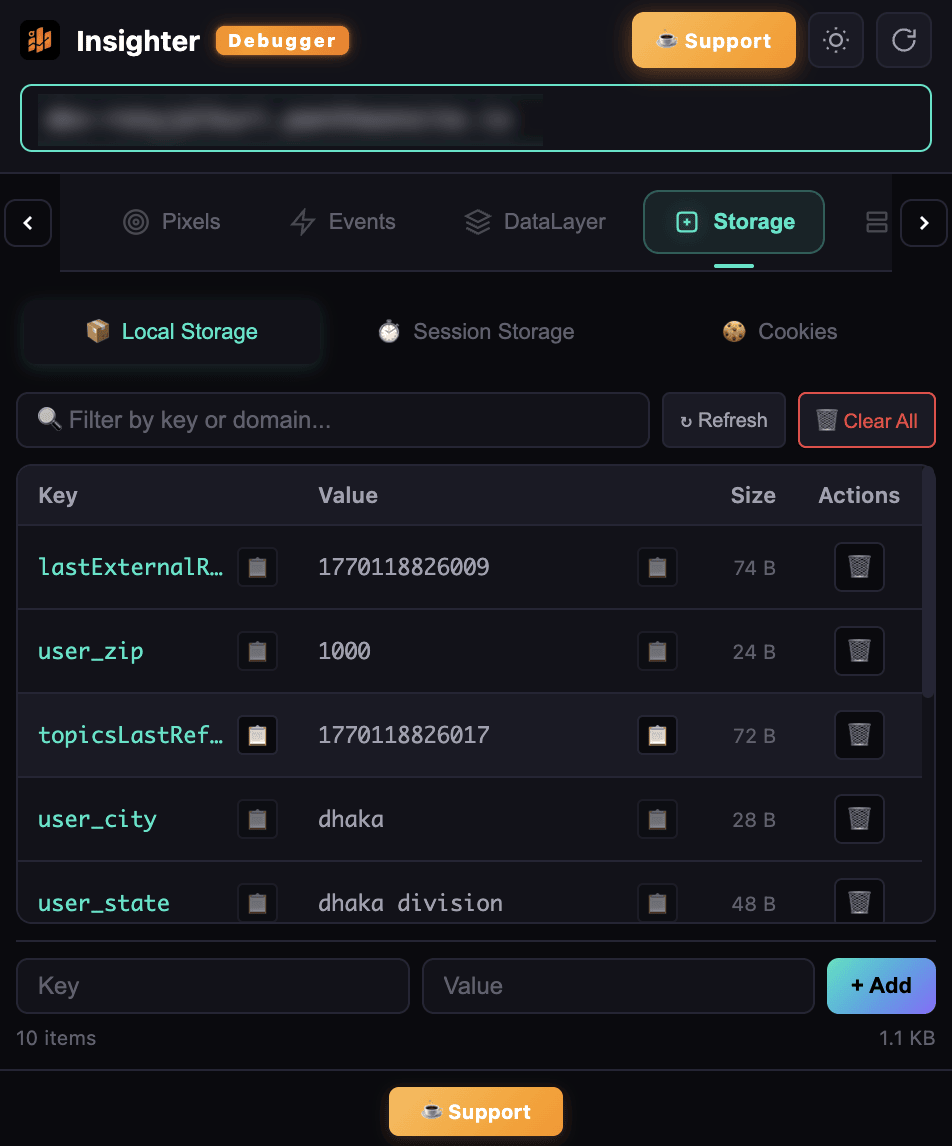 View, edit & delete cookies, localStorage & sessionStorage with size tracking & filtering.